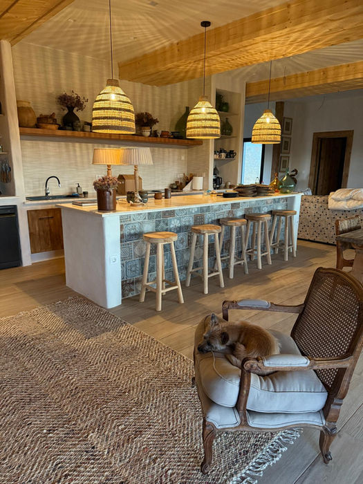 A beautifully hand crafted home wooden patterned floor tiles set the tone, hand-woven linen and wool curtains soften the light, and modern comforts like air conditioning and heating blend seamlessly with an open wardrobe, large sliding doors to a sun-kissed terrace, luxury bedding and cotton bathrobes, all complemented by three inviting lounging areas indoors and out, and an open-plan kitchen and dining space designed for relaxed, elegant living.